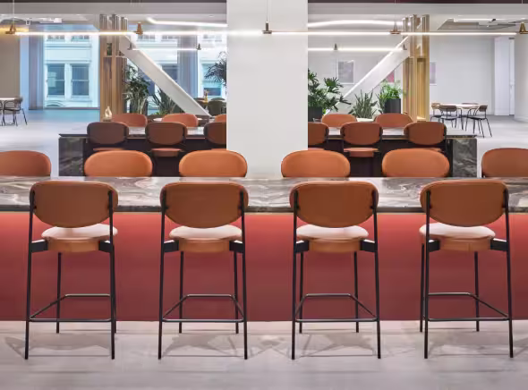 The location celebrates the city's illustrious weather phenomenon "Karl, the Fog" with an etherial statement light fixture as well as reflective art and decor.